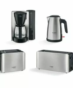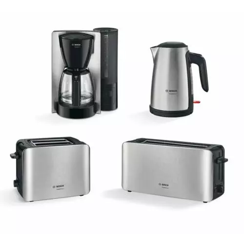 Bosch TKA6A643. Produkttyp: Filterkaffeemaschine, Kaffee-Einfüllart: Gemahlener Kaffee, Behälter für gebrühten Kaffee: Karaffe. Leistung: 1200 W. Produktfarbe: Schwarz, Edelstahl