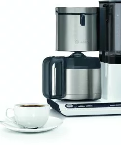 Bosch TKA8A681. Produkttyp: Filterkaffeemaschine, Kaffeezubereitungstyp: Halbautomatisch, Fassungsvermögen Wassertank: 1,1 l, Kaffee-Einfüllart: Gemahlener Kaffee, Behälter für gebrühten Kaffee: Karaffe, Kapazität (in Tassen): 8 Tassen. Leistung: 1100 W. Produktfarbe: Schwarz, Edelstahl, Weiß