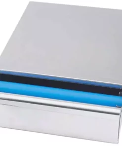 Ersatzrolle zu Kaffeesatz-Lade aus Edelstahl, hochglänzend, zum Ausklopfen von Kaffeesatz, rollengelagerte Schublade, Griffmulde in Blende, Walze innen aus blauem Kunststoff, mit angenieteten Gummifüßen