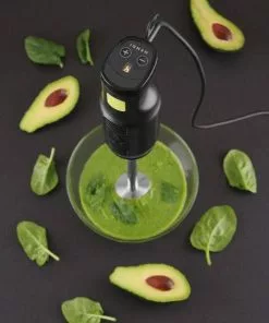 Von Robert Bronwasser für Köche entworfen. ABS-Kunststoffgehäuse und Edelstahlschaft. Gekreuzte Edelstahlmesser mit Titaniumbeschichtung. Leistungsstarker 250W Motor, 6 Geschwindigkeitsstufen mit LCD-Anzeige. Maximale Drehzahl 13500 U/Min. Geeignet für 1-4 Liter.