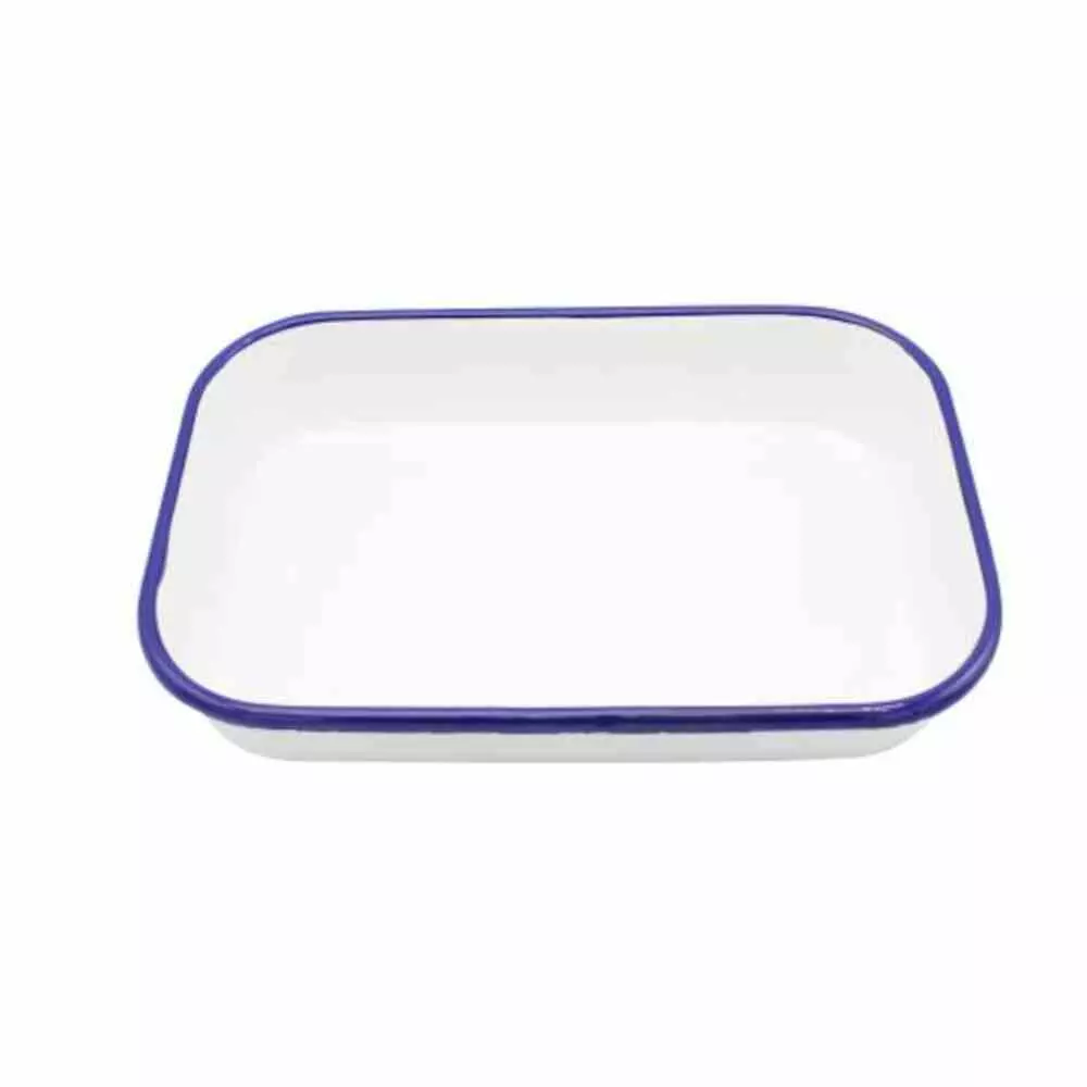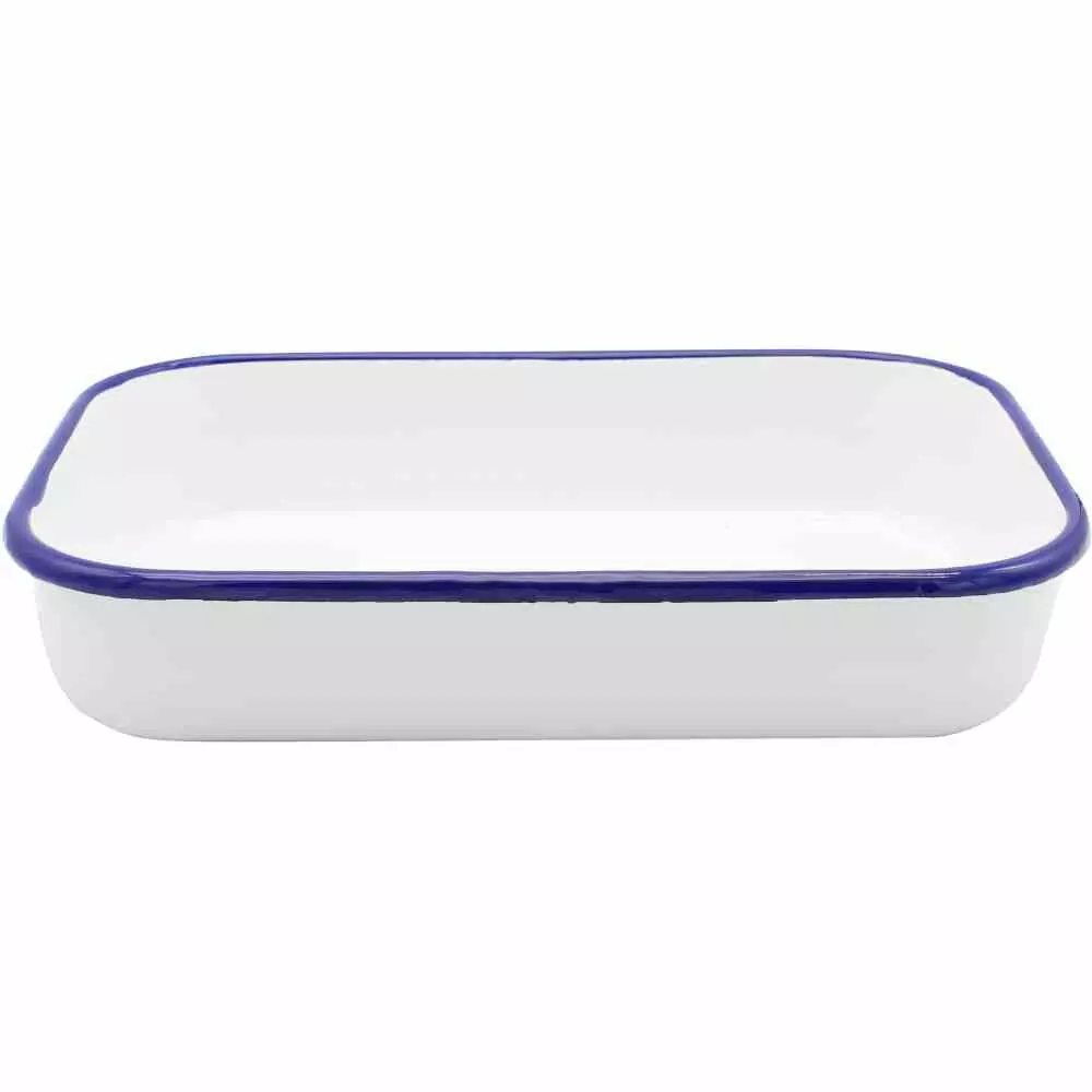 - weiß emaillierte Auflaufschale mit blauem Rand
