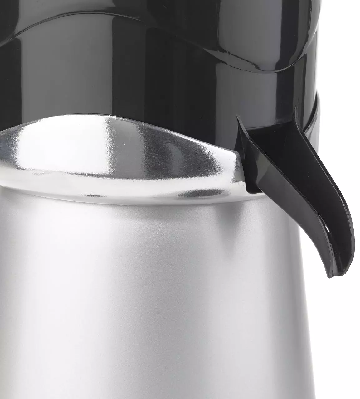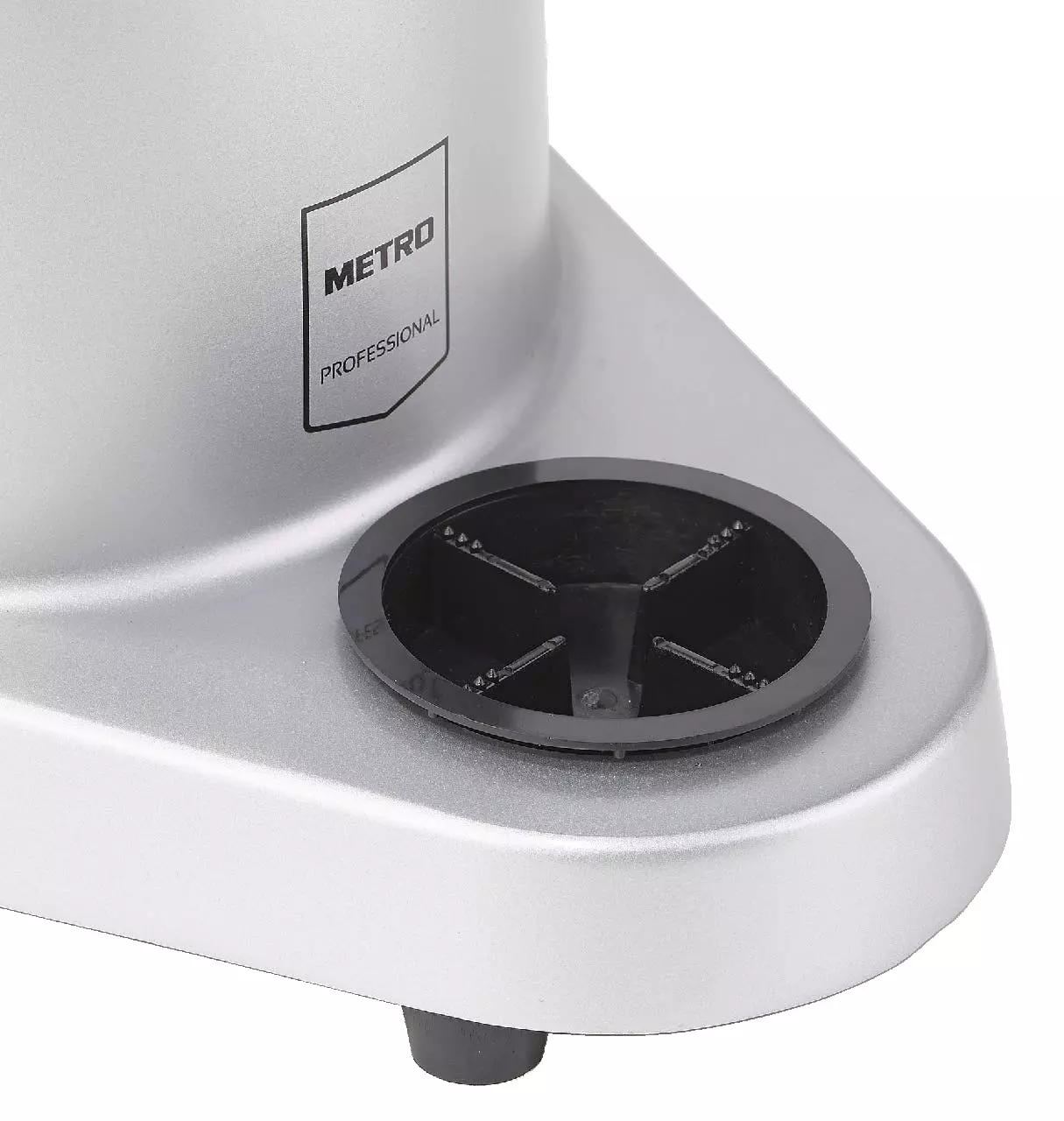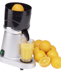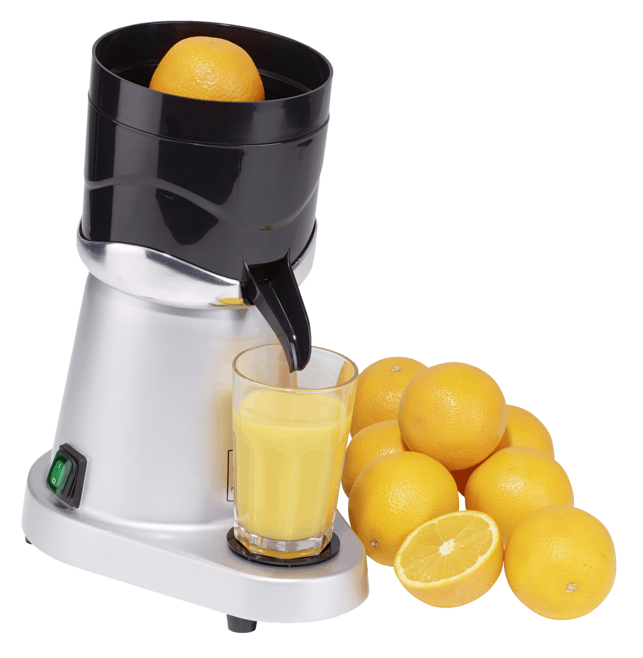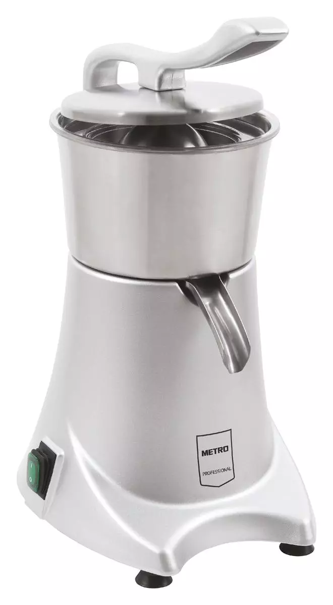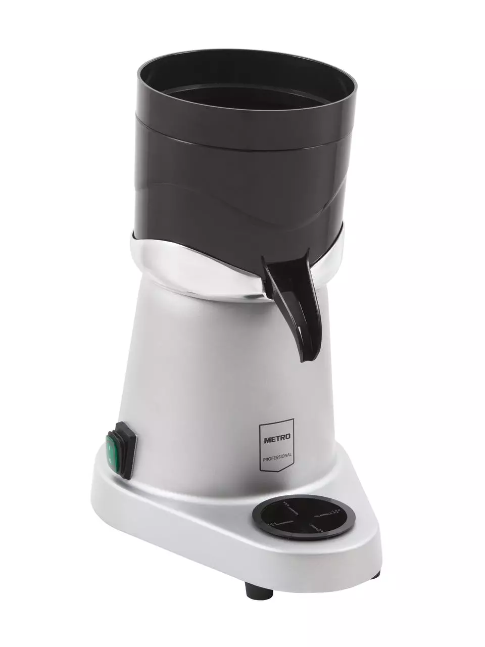 Der METRO Professional Entsafter in Silber und Schwarz hat eine Leistung von 180 W, einen Überhitzungsschutz, einen Ein/Aus-Schalter mit Licht und 3 unterschiedlich große Entsafterkegel.