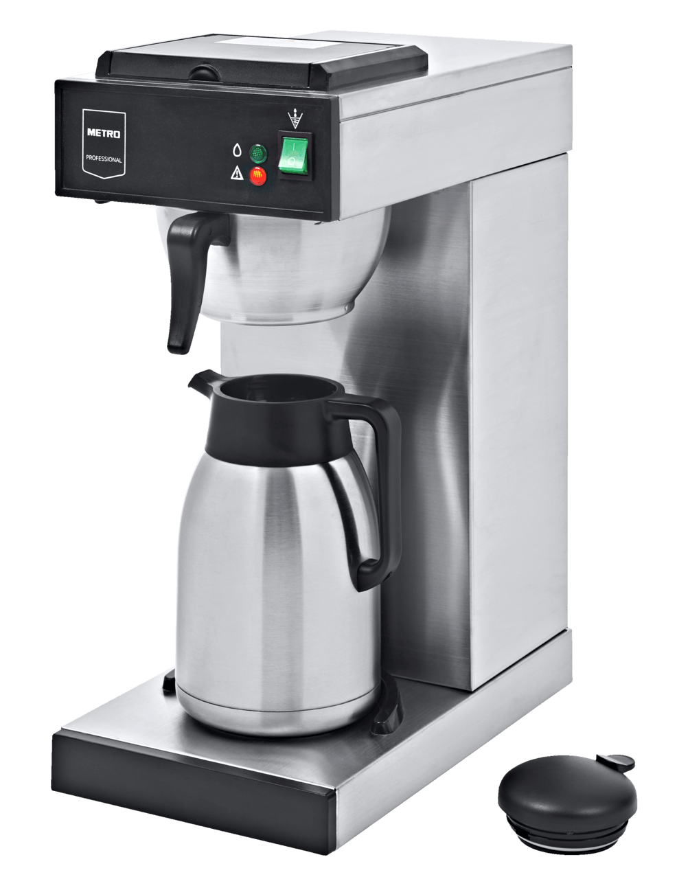 Die METRO Professional Kaffeemaschine verfügt über eine Isolierkanne mit dem Fassungsvermögen von 2 Litern und einem Wassertank von 2,3 Litern. Das Produkt verfügt über eine Reset-Knob, ein Ablassventil für eine einfache Reinigung und eine Warnleuchte, die anzeigt, wann die Maschine entkalkt werden muss. Im Lieferumfang enthalten sind eine Isolierkanne und 100 Papierkaffeefilter. Diese haben einen Durchmesser von 24,5cm. Der Boden hat einen Durchmesser von 10,5cm.