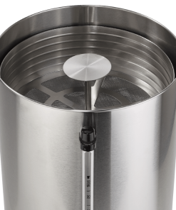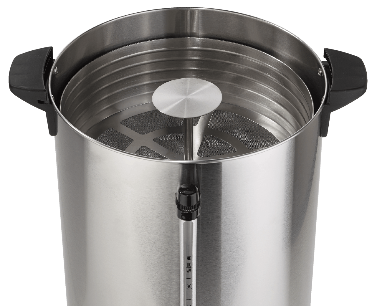 Die METRO Professional Kaffeemaschine GCM4015 hat eine Leistung von 1650 W und ein Fassungsvermögen von 15 L (entspricht ca. 100 Tassen in 50 Min.). Die Oberfläche des Produkts lässt sich leicht reinigen und besteht aus Edelstahl 304. Der Deckel verfügt aus Sicherheitsgründen über einen Drehverschluss. Außerdem verfügt das Produkt über ein Heizelement aus Aluminium und eine Warmhaltefunktion. Das Produkt hat einen Überhitzungsschutz sowie eine automatischen Reset-Funktion. Das Produkt hat die folgenden Maße: 35 x 38 x 53.5 cm (B x L x H).