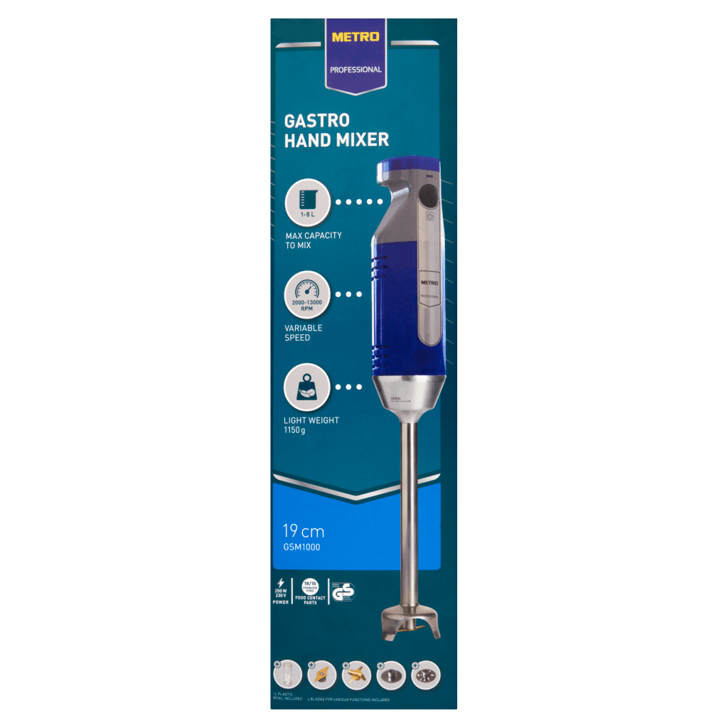 Der METRO Professional Stabmixer GSM1000 (in blau / silber) ist für ein Volumen von 1 bis 8 Liter geeignet. Für eine einfache Reinigung verfügt das Produkt über einen abnehmbaren Mixstab. Das Produkt hat eine Leistung von 120-250 W, 230 V, variable Drehzahl: 2. 000 – 13. 000 U/min, eine Schaftlänge von 19 cm und ein Gewicht von 1150 g. Der Stabmixer ist aufhängbar und wird mit einer 1 Liter Kunststoffschale und unterschiedlichen Klingen für verschiedene Funktionen geliefert: ein Aufsatz zum Zerkleinern (z. B. von Eis und gefrorenen Früchten) ein Aufsatz zum Hacken von Fleisch und Gemüse, ein Aufsatz zur Herstellung von Milchshakes, zum Schlagen von Eiweiß oder zum Schlagen von Sahne. Außerdem verfügt das Produkt über einen Aufsatz mit Belüftungsfunktion.