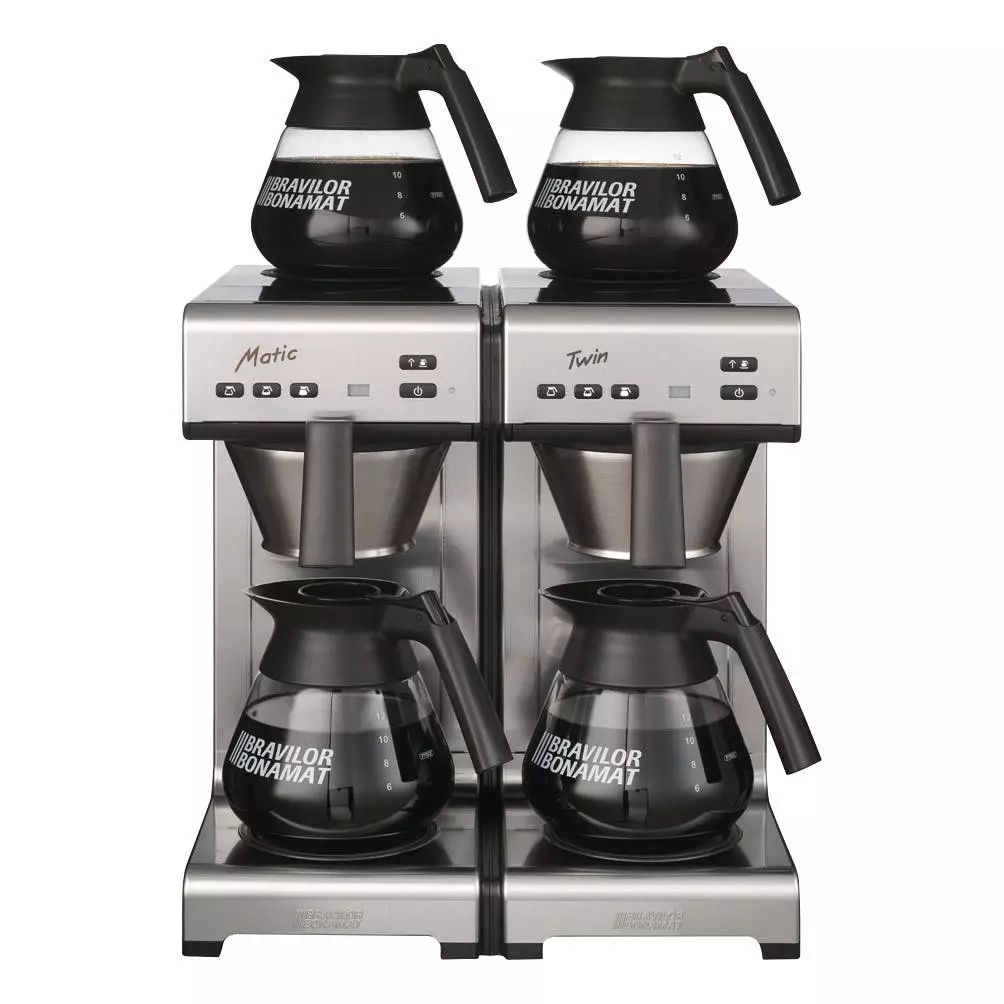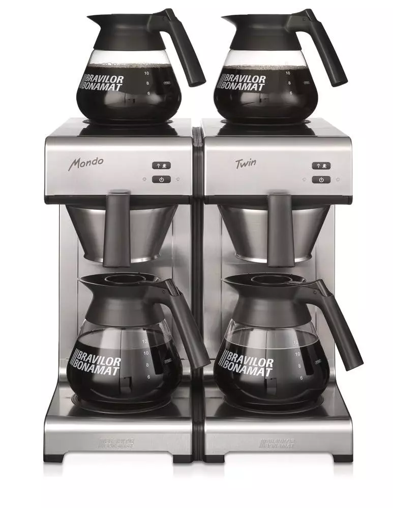 Bravilor Bonamat Filterkaffeemaschine Mondo Twin Kaffee- und Teebrühmaschine mit manueller Wasserbefüllung. Ausführung: > 2 Brühsystem > 2 Edelstahlfilterpfanne > 4 Warmhalteplatten, selbstregulierend > 4 Glaskannen Ausstattung: > CNS-Durchlauferhitzer