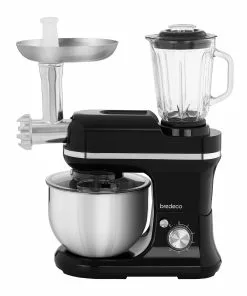 Küchenmaschine – inkl. Mixer & Fleischwolf – 1.200 W Die kompakte Küchenmaschine von bredeco ist ein besonders leistungsstarkes sowie robustes Multifunktionswunder. Das Gerät eignet sich sowohl zum Mischen, Schlagen und Kneten als auch zum Zerkleinern, Pürieren und Mixen verschiedenster Zutaten. Neben der klassischen Rührschüssel mit Schneebesen, Teig- und Rührhaken verfügt die Küchenmaschine über einen leistungsstarken Mixer sowie einen Fleischwolf und vereint damit drei wichtige Küchengeräte in einem.
