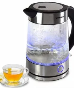 Glas-Wasserkocher mit blauem Licht • 2000 Watt Leistung • 1,7 Liter Volumen • Cool-Touch-Griff rostfreier Edelstahl, gebürstet • kabellos – Kessel von Station abnehmbar 360° Funktion • Filter am Ausguss • Wasserstandsanzeige • An- und Ausschalter • Betriebs-LED Stromversorgung: 230V, 50Hz • verdecktes Heizelement • automatische Abschaltung sobald das Wasser heiß ist